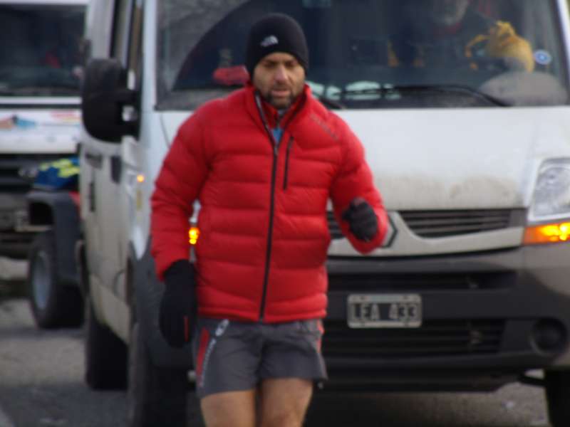 Las muy bajas temperaturas que se registraron hoy a las 09:00 hs cuando Federico Sciurano partio nuevamente para continuar con su ultra maratón solidaria, no impidió que el Intendente de Ushuaia continué con su cometido.