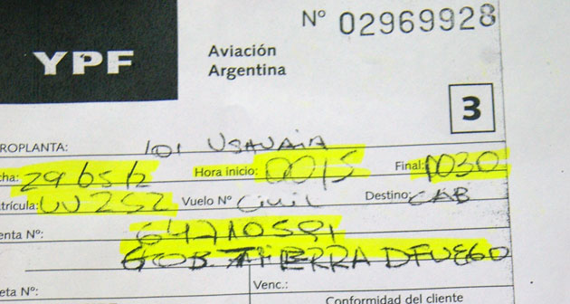 Tal como se puede constatar por factura Nº 2969928 de YPF (Aeroplanta Ushuaia) el 29/05/12 a las 00:15hs (finalizada la tarea de carga a las 00:30hs) la máquina de Top Air SA LV-ZSZ, reaprovisionó 2.219 lts de JP1 (en ese momento al precio de $ 5,20 por litro) por orden del piloto Zalotti, con cargo a la cuenta Nº 64710591 de la Gobernación de Tierra del Fuego en un vuelo de cabotaje, cuyo destino no se identifica.