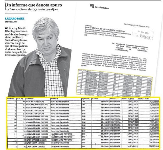 El empresario kirchnerista Lázaro Báez y su hijo Martín revisaron las 14 cajas de seguridad que tienen en el Banco Santa Cruz, en Río Gallegos, dos días después de que el fiscal Guillermo Marijuan le pidiera al juez Sebastián Casanello que las allanara en la causa por presunto lavado de dinero , y seis días antes de que la medida fuera ejecutada. Las visitas quedaron registradas el 29 y 30 del mes pasado. Así lo informó la entidad santacruceña al Banco Central, según las constancias que fueron facilitadas a LA NACION.