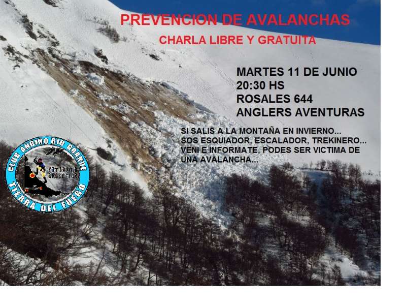 RIO GRANDE.- El Club Andino Río Grande ha programado realizar una charla informativa sobre Prevención de Avalanchas, la que se brindará el martes 11 de junio a la hora 20:30, en el local comercial de Anglers Aventuras Fly Shop, ubicado en Rosales 644 de esta ciudad, y la misma tiene entrada libre y gratuita.