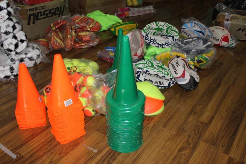 El material deportivo incluye entre otros, indumentaria para los equipos, pelotas para las distintas disciplinas, botiquines de primeros auxilios, steps para gimnasia aeróbica, colchonetas, flotadores de agua, aros de gimnasia artística, raquetas de tenis, mini canchas de tenis, patines para hielo, palos de hockey, etc.