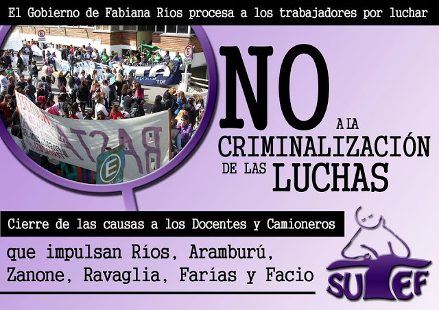 Juev 11/07/13 20:40 hs.-El portal de noticias de Tendencia Piquetera Revolucionaria (TPR) publicó hoy un afiche en el que acusa a la gobernadora Fabiana Rios, Guillermo Aramburu, el Ministro Zanone, Ravaglia y el Secretario de Seguridad, Daniel Facio de querer procesar a los trabajadores del SUTEF y Camioneros por luchar.