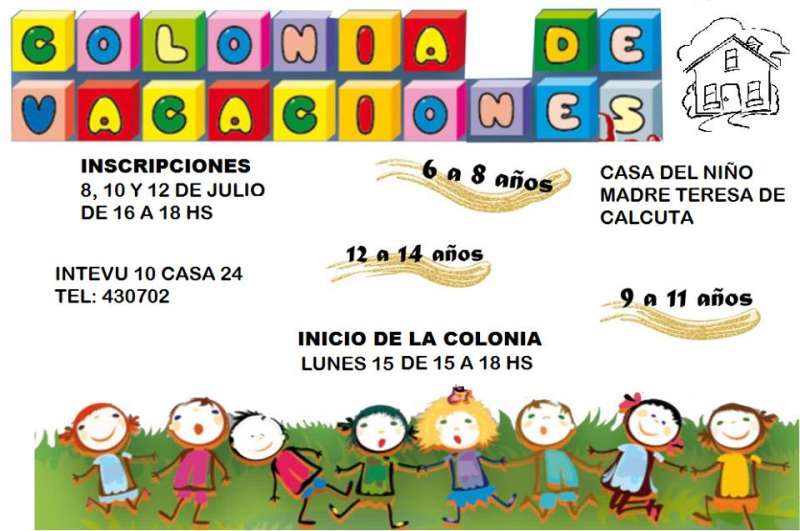 Lun 08/07/13 08:53 hs.- La Casa del Niño, Teresa de Calcuta informa que este lunes 8 comienzan las inscripciones para las colonias de vacaciones para niños de 6 a 8, de 9 a 11 y de 12 a 14 años, las mismas se llevaran a cabo los días 8, 10 y 12 de Julio de 16 a 18 hs.