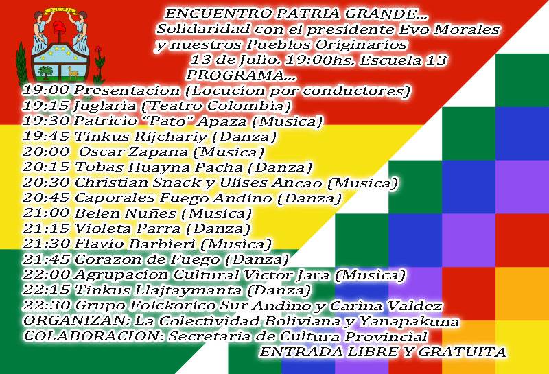 En este contexto, “la comunidad de Ushuaia reaccionó positivamente y unió fuerzas y capacidad de organización para generar el «Encuentro Patria Grande. Solidaridad con el Presidente Evo Morales y nuestros Pueblos Originarios» el que se realizará el 13 de julio, a partir de las 9 horas, en el SUM de la Escuela 13 de nuestra ciudad”.
