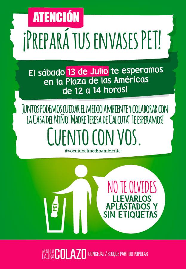 RIO GRANDE, 10/07/13 17:59 hs.-La Concejal María Laura Colazo, a cargo de la Comisión de Turismo, Ecología y Medio Ambiente, invita a los vecinos de esta ciudad a participar de la recolección de envases PET que se llevará a cabo este sábado 13 de Julio en la Plaza de las Américas en el horario de 12 a 14.