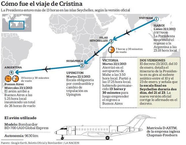 Mart 20/08/13 10:03 hs.-El 21 de enero de 2013, a las 23.18 (hora local), Cristina Kirchner despegó de Vietnam a bordo de un avión matrícula inglesa D-AXTM. La aeronave y su tripulación estaban en condiciones de volar 13 horas. Sin embargo, sin que mediara una emergencia, 7 horas y media después el avión aterrizó en el aeropuerto de Mahe, Seychelles, un paraíso turístico y fiscal en el océano Índico . Las preguntas empiezan allí.