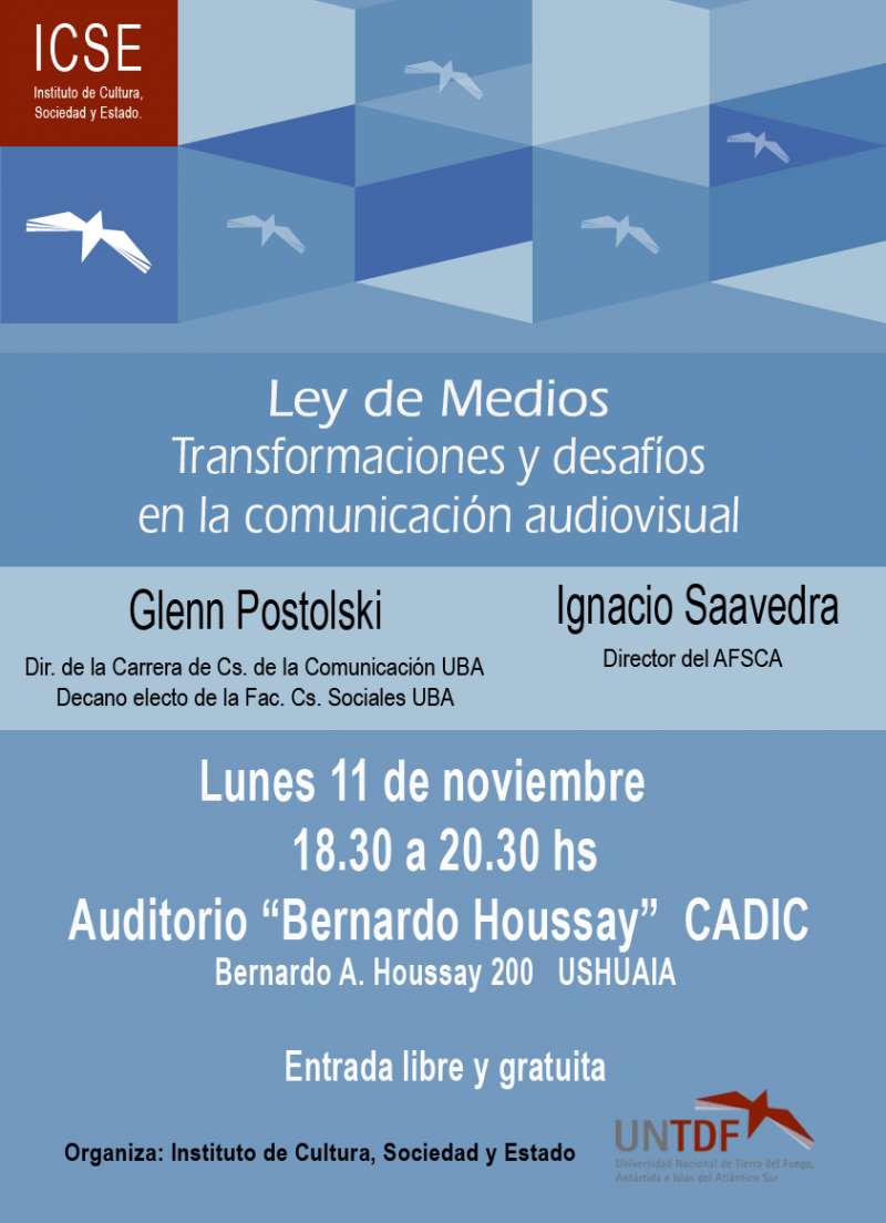 La Universidad Nacional de Tierra del Fuego (UNTDF), a través del Instituto de Cultura, Sociedad y Estado (ICSE) impulsa la conferencia debate “Ley de Medios: Transformaciones y desafíos en la comunicación audiovisual”. El encuentro se realizará en Ushuaia, el lunes 11 de noviembre en el auditorio “Bernardo Houssay” del CADIC, a partir de las 18.30 horas.