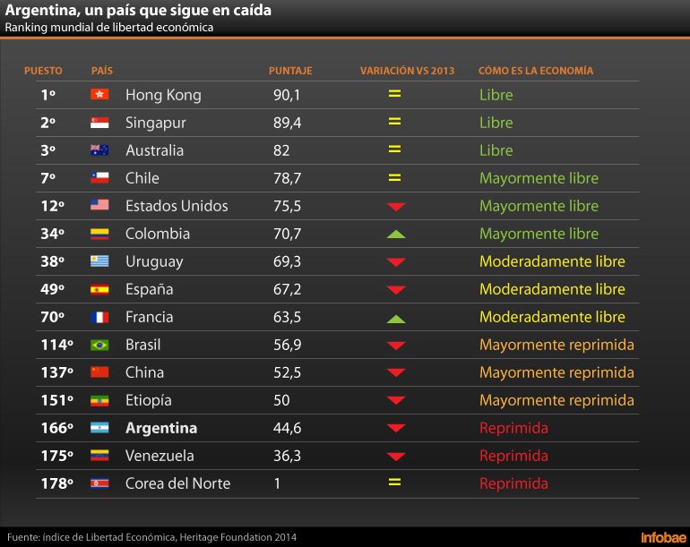 14/01/14 08:15 hs.-Descendió seis lugares hasta la posición 166 entre 178 países. Según el índice de la Heritage Foundation, es una «economía reprimida» con alta inflación, control de precios y un BCRA que «no es más independiente». Infografía
