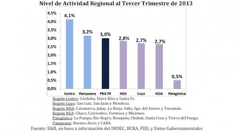 Destaca el trabajo de Economía & Regiones que «el crecimiento de la actividad regional en el tercer trimestre habría sido impulsado por la performance observada por el sector agrícola-ganadero 7,4%, la construcción 5,6%, impulsada en su mayoría por el incremento de la obra pública, el transporte 5.5% y la intermediación financiera 4,7 por ciento.