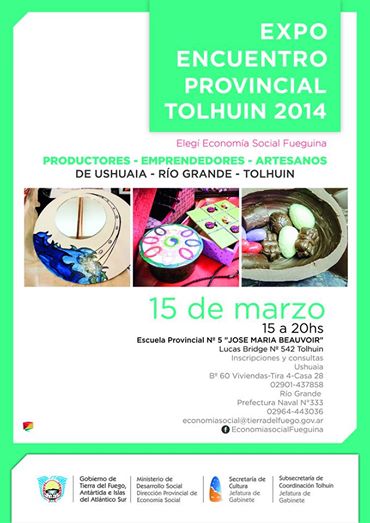 USHUAIA, 5/03/14 19:55 hs.-Desde la Dirección Provincial de Economía Social se convoca a Productores, Emprendedores y Artesanos de la provincia a inscribirse para la Expo Encuentro Provincial bajo el lema “Elegí Economía Social Fueguina”. La misma se realizará en la localidad de Tolhuin, el próximo 15 de marzo de 15 a 20 en la Escuela Provincial Nº 5 José María Beauvoir.