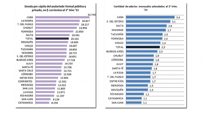 Así -se desprende del informe- la deuda promedio de un empleado formal pasó de 1,8 salarios brutos en el tercer trimestre del año 2003 a 2,3 para el mismo período de 2013; es decir un aumento del 32 por ciento.