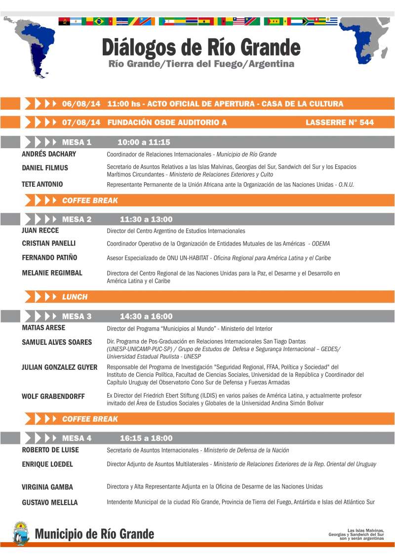Mart 05/08/14 16:42 hs.-Este miércoles a las 11:00 en Casa de la Cultura se estará realizando el acto de apertura de las jornadas de ‘Diálogos de Río Grande’ que se realizan por primera vez en la ciudad en el marco de la Resolución de la Asamblea General de Naciones Unidas sobre Zona de Paz y Cooperación del Atlántico Sur, y que convoca a representantes de Latinoamérica y África comprendidos en el ámbito de influencia del Atlántico Sur.