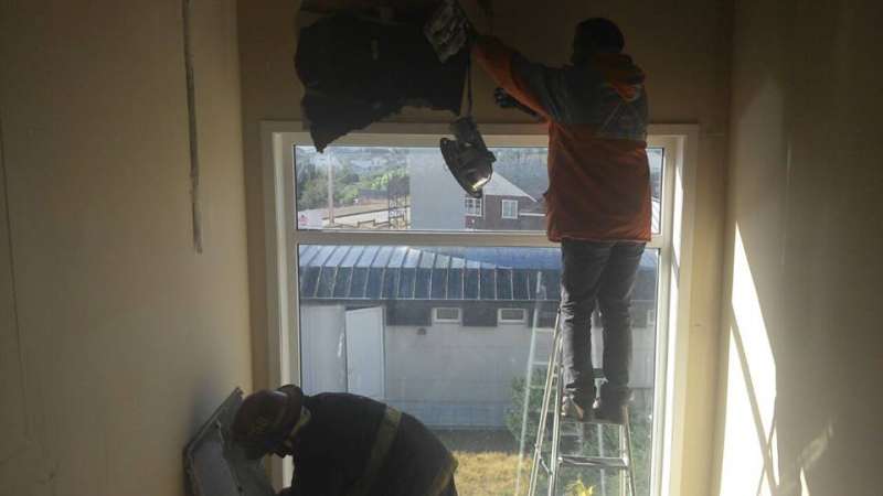 A las 9:15 horas ante el llamado de defensa civil municipal, concurre el móvil 19,al ex hotel los Yaganes, donde se produjo un derrumbe del cielo raso, causado porque rebalso el tanque de agua, se inundó todo, no hubo heridos solo daños materiales