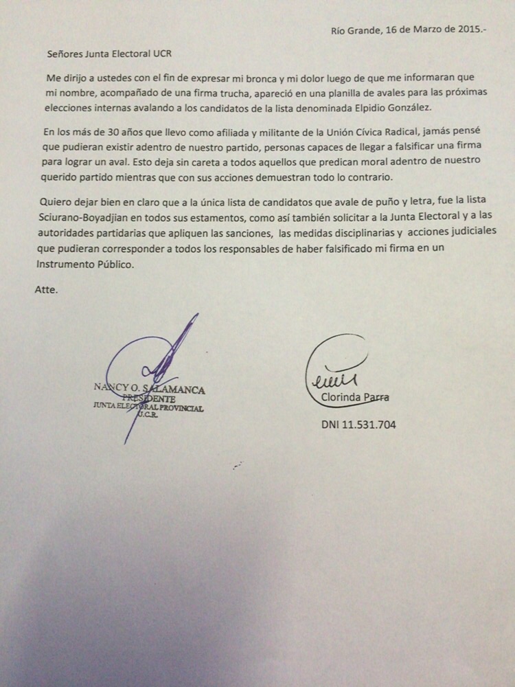 Parra continúa su denuncia diciendo que “en los más de 30 años que llevo como afiliada y militante de la Unión Cívica Radical, jamás pensé que pudieran existir adentro de nuestro partido, personas capaces de falsificar una firma para lograr un aval. Esto deja sin careta a todos aquellos que predican moral adentro de nuestro querido partido mientras que con sus acciones demuestran todo lo contrario”.