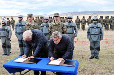San Sebastián.- Los ministros de Defensa de Argentina y Chile, Agustín Rossi y Jorge Burgos Varela firmaron el ‘acta de San Sebastián’ en el que declararon Tierra del Fuego zona libre de minas antipersonales, las cuales fueron sembradas a finales de la década del setenta, en medio de un conflicto que casi llevó a Chile y Argentina a una guerra.