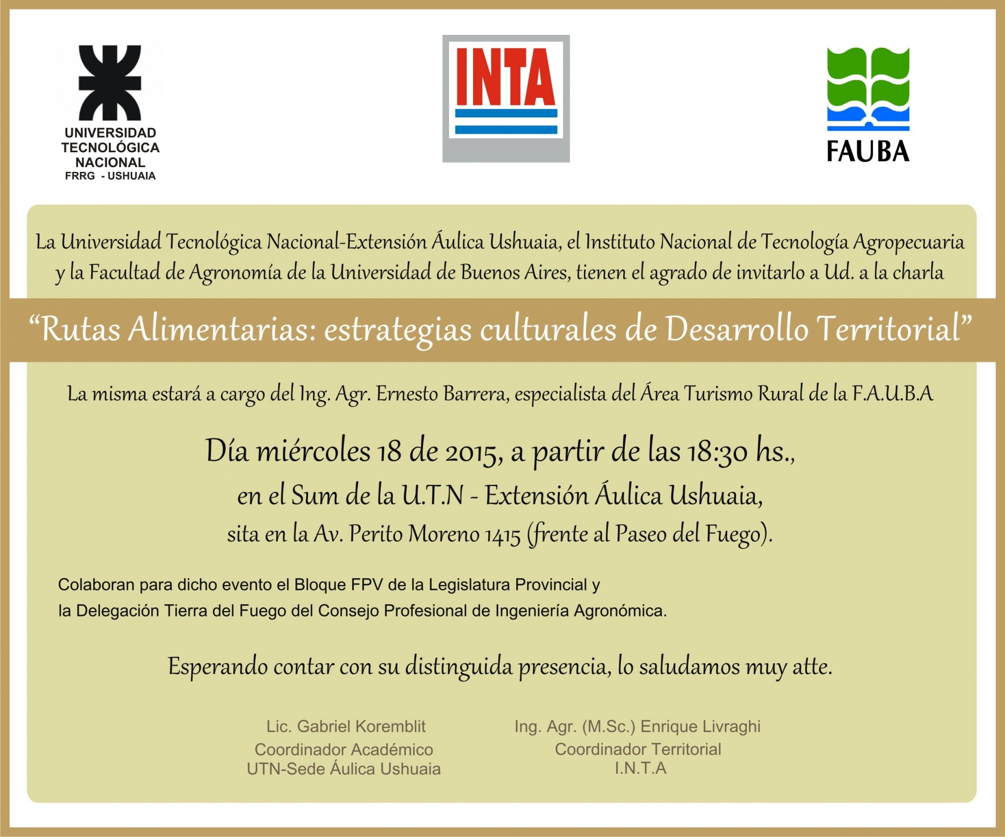 Lun 16/11/15 .- Un especialista en Turismo Rural de la Facultad de Agronomía de la Universidad de Buenos Aires dictará una charla sobre Rutas Alimentarias: estrategias culturales de Desarrollo Territorial”, impulsada por la Agencia de Extensión Rural (AER) Ushuaia y la Universidad Tecnológica Nacional (UTN).