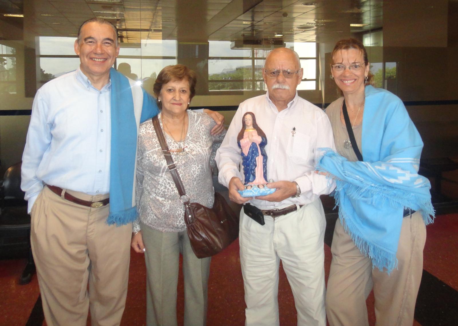 La réplica de la Virgen de Luján que está recorriendo Argentina y el año próximo llegará a algunas comunidades de Brasil, Paraguay y Uruguay, es tal cual llegó en 1630 desde Pernambuco (Brasil), sin manto, corona, medialuna y rayera. Precisamente dicha imagen es obra de Vicente Juárez, reconocido y talentoso escultor salteño. Adjuntamos fotos de los matrimonios Figueroa y Juárez y otra que refleja el traspaso de la posta cuando Carlos Figueroa, además de entregar la imagen, le coloca el poncho argentino a Vicente Juárez.