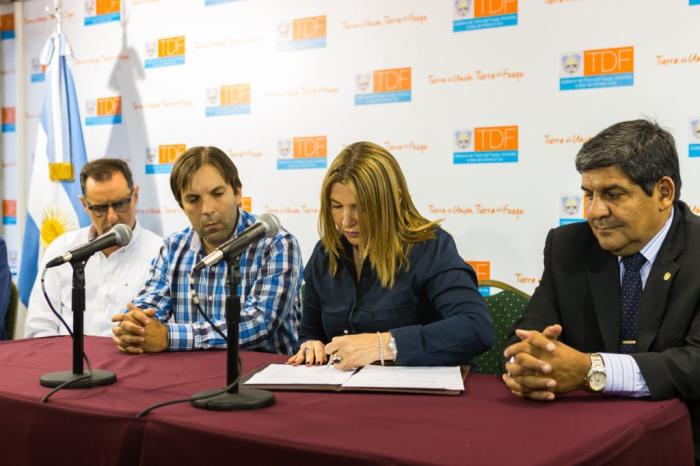Mart 02/01/16 .- La gobernadora Rosana Bertone y representantes de las empresas Camuzzi y Supercemento suscribieron el acta de inicio de obra. La ampliación será de 4,3 kilómetros de extensión y uno de los tramos atravesará el cauce del río Grande. La inversión será de 59 millones de pesos.