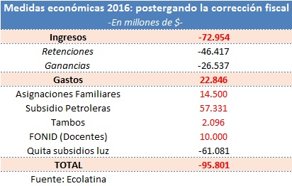 De hecho, salvo el recorte de subsidios a la luz y una leve reducción del empleo público, las primeras medidas del nuevo gobierno expandieron aún más el abultado rojo fiscal. Entre ellas, destacan: la eliminación de los derechos de exportación a los productos agropecuarios, mineros, e industriales (con excepción de la soja, cuya retención fue reducida un 5%), la reforma del impuesto a las ganancias, la prórroga del subsidio a las petroleras, el nuevo subsidio a los tambos, la ampliación de recursos destinados al FONID (Fondo Nacional de Incentivo Docente) y las negociaciones para devolver el 15% de la masa coparticipable a las provincias.