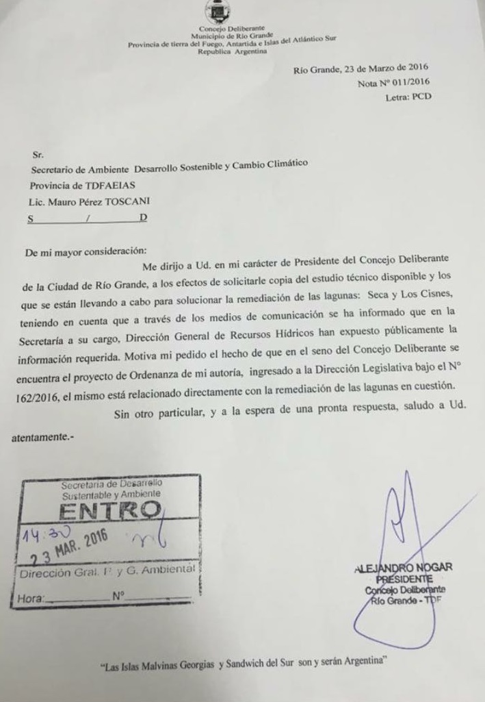 El Edil recordó que desde hace más de una semana que “en el seno del Concejo Deliberante existe un proyecto de ordenanza de mi autoría, ingresado a la Dirección Legislativa con el número de legajo 162/2016 y que se remite directamente al trabajo tendiente a la remediación de los problemas que generan las lagunas Seca y Los Cisnes”.