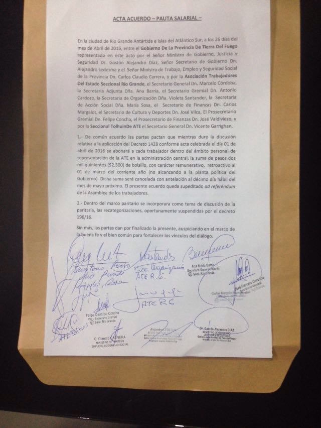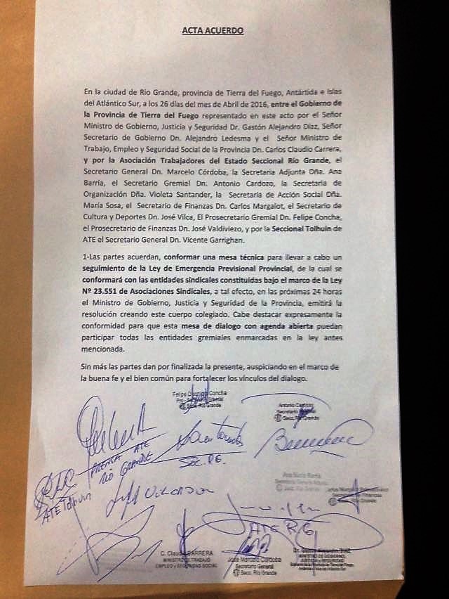 El Ministro de Gobierno, Justicia y Seguridad informó hace instantes que se firmó un acta mediante la cual se crea una mesa técnica con ATE y las entidades sindicales amparadas en la Ley 23.55. La resolución se emitirá en el plazo de 24 hs, dijo el funcionario.