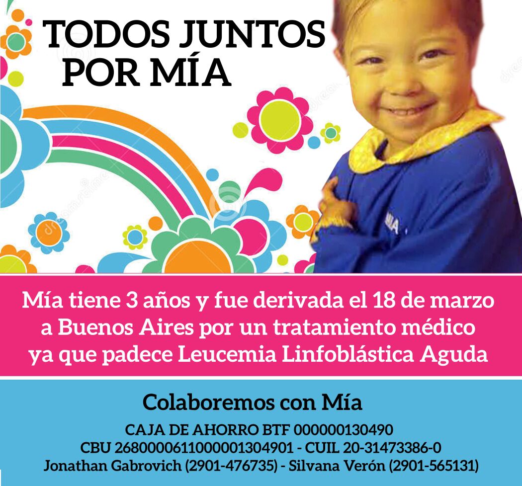 Ushuaia, 3 de abril.- Mia Gabrovich tiene 3 años, es de Ushuaia y se encuentra derivada en Buenos Aires con diagnóstico de Leucemia Linfoblástica Aguda, bajo tratamiento médico en el Hospital Italiano de San Justo.