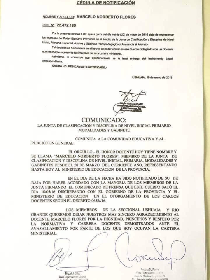 Sab 21/05/16 .- El docente que nombró el Poder Ejecutivo en la Junta de Clasificación y Disciplina en Ushuaia votó junto a los demás representantes de las juntas de Río Grande y Ushuaia la discrepancia en el otorgamiento de los cargos según el decreto 0658/16.