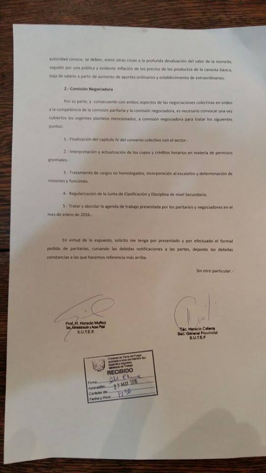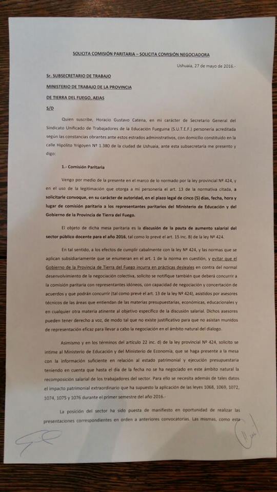 Vengo por medio de la presente en el marco de lo normado por la ley provincial Nº 424, y en el uso de la legitimación que otorga a mi personería el art. 13 de la normativa citada, a solicitarle convoque, en su carácter de autoridad, en el plazo legal de cinco (5) días, fecha, hora y lugar de comisión paritaria a los representantes paritarios del Ministerio de Educación y del Gobierno de la Provincia de Tierra del Fuego.