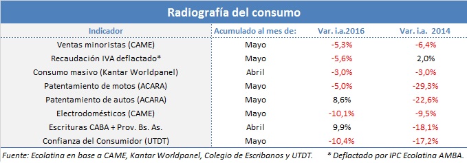 Según nuestras estimaciones, el consumo agregado (privado + público) cayó casi 3% i.a. en el primer trimestre de 2016. Asimismo, los primeros indicadores privados del segundo trimestre indican que la retracción persiste. Por caso, la recaudación tributaria de IVA deflactada por el IPC Ecolatina AMBA, cayó 5,9% i.a. en el primer trimestre y 5,1% i.a. en el bimestre abril-mayo de 2016.