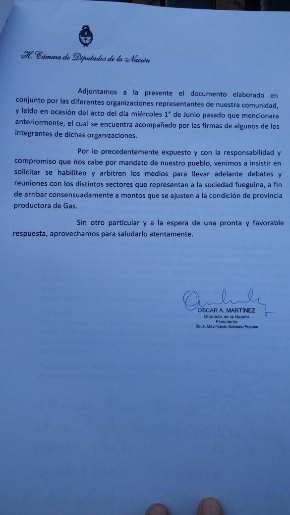 El escrito presentado al Ministro Frigerio manifiesta, finalmente, que «Por lo precedentemente expuesto y con la responsabilidad y compromiso que nos cabe por mandato de nuestro pueblo, venimos a insistir en solicitar se habiliten y arbitren los medios para llevar adelante debates y reuniones con los distintos sectores que representan a la sociedad fueguina, a fin de arribar consensuadamente a montos que se ajusten a la condición de provincia productora de Gas».