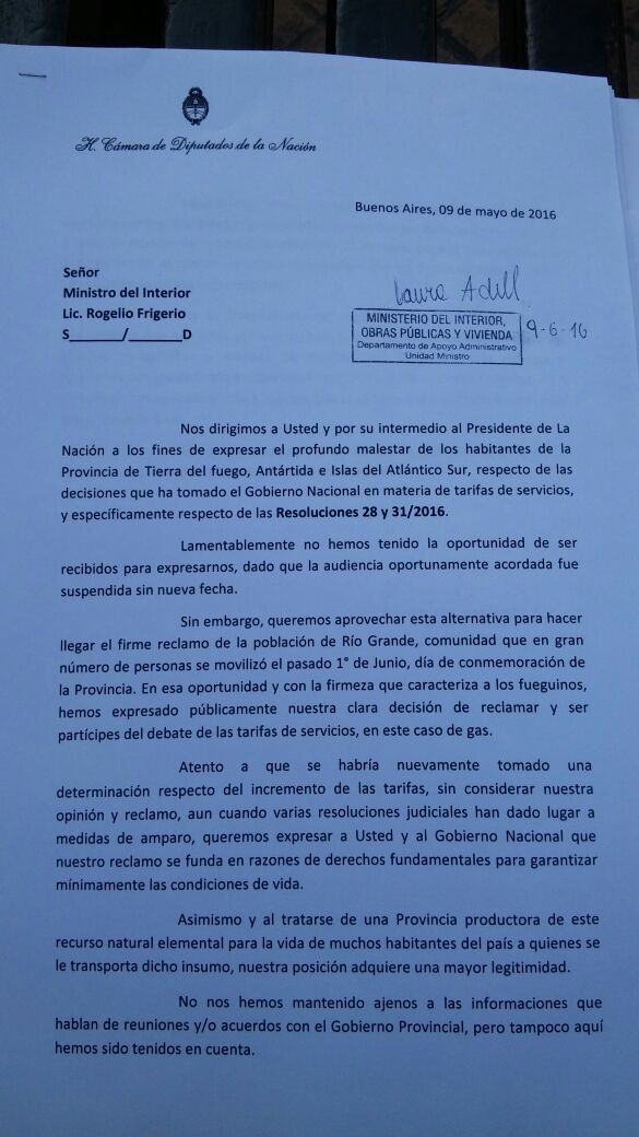 Río Grande – La nota dirigida al Ministro del Interior, Rogelio Frigerio, comienza expresando que «Nos dirigimos a Usted y por su intermedio al Presidente de la Nación, a los fines de expresar el profundo malestar de los habitantes de la provincia de Tierra del Fuego, Antártida e Islas del Atlántico Sur, respecto de las decisiones que ha tomado el Gobierno Nacional en materia de tarifas de servicios, y específicamente respecto de las Resoluciones 28 y 31 / 2016».Lamenta la misiva que la delegación que integrarían el diputado Oscar Martínez, con el Decano de la UTN, Ing Mario Ferreyra; más los dirigentes del Sindicato de Petróleo y Gas Privados, y del Sindicato de Petroleros Jerárquicos, no tuvo «la oportunidad de ser recibidos para expresarnos, dado que la audiencia otorgada, oportunamente acordada, fue suspendida sin nueva fecha».