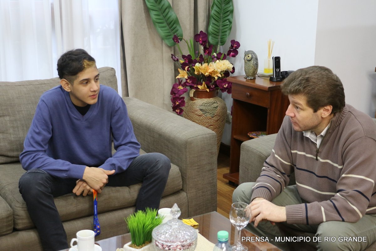 Rio Grande 16/07/16 .-El intendente Gustavo Melella, acompañado del Gerente Ejecutivo de la Agencia Municipal de Deportes y Juventud, profesor Diego Lassalle, recibió al joven campeón sudamericano de Taekwondo, Facundo Amaya, quien vino acompañado del entrenador, Marcelo Villarroel