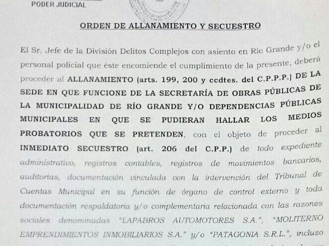 Ocurrió esta noche por orden del Juez Leonelli y a partir de una denuncia del abogado Francisco Gimenes en la que habla de peculado y beneficio a dos empresas. La orden del Juez señala a la secretaria o cualquier lugar donde se pudieran encontrar elementos probatorios y el secuestro inmediato de dichas pruebas relacionadas con las empresas Lapabros Automotores, Politerno Emprendimientos Inmobiliarios y Patagonia SRL.