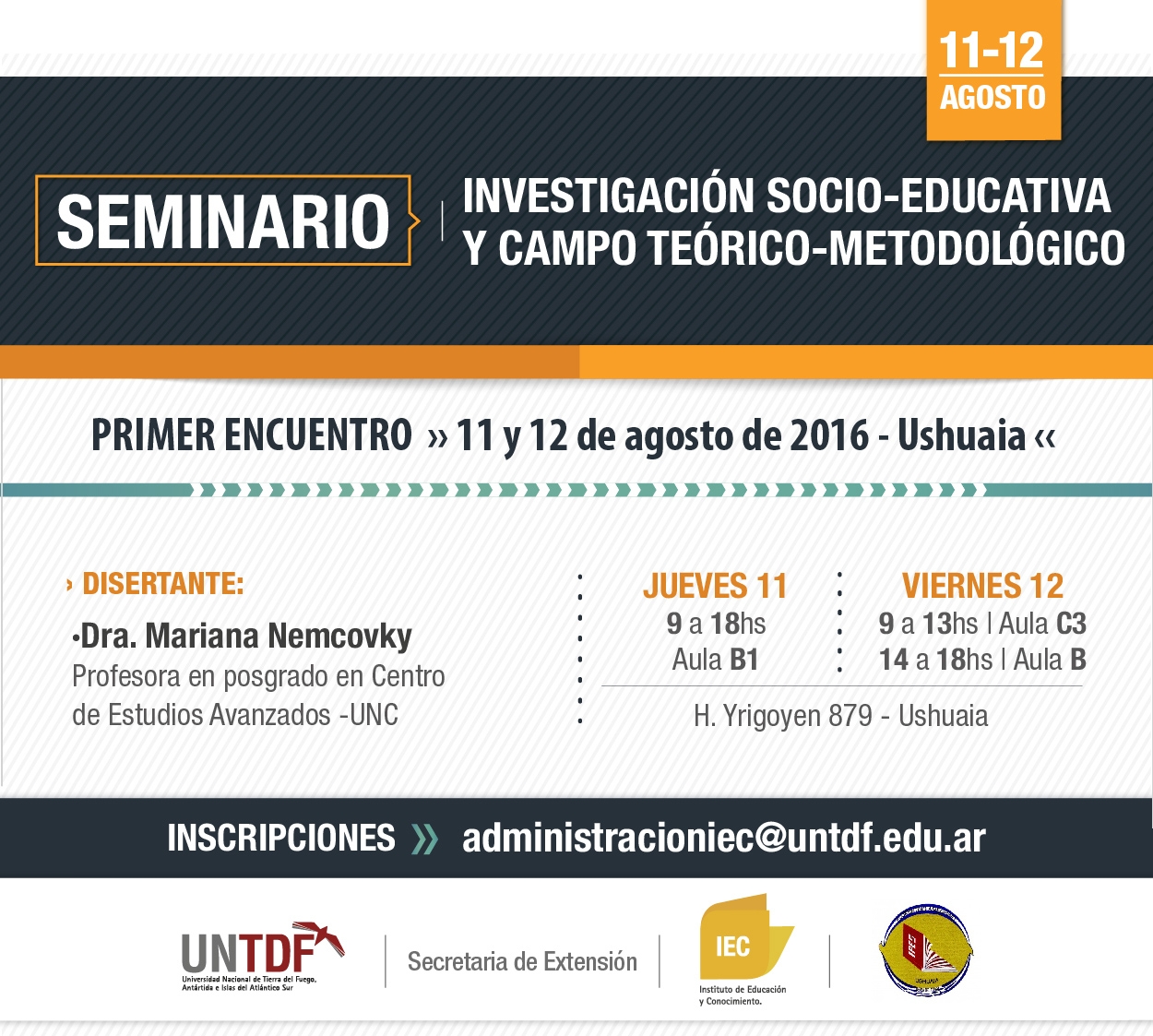 Ushuaia.- La Universidad Nacional de Tierra del Fuego (UNTDF) junto al Instituto Provincial Educación Superior (IPES) Florentino Ameguino de Ushuaia realizará el Seminario Taller Investigación Socio-educativa y Campo Teórico-metodológico, a cargo de la doctora Mariana Nemcovky.