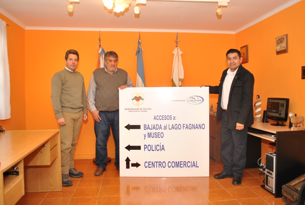 Para finalizar la reunión el Intendente Claudio Queno, Mauro Gonzales y Carrasco presentaron los carteles de señalización que se van a instalar en las calles de Tolhuin.