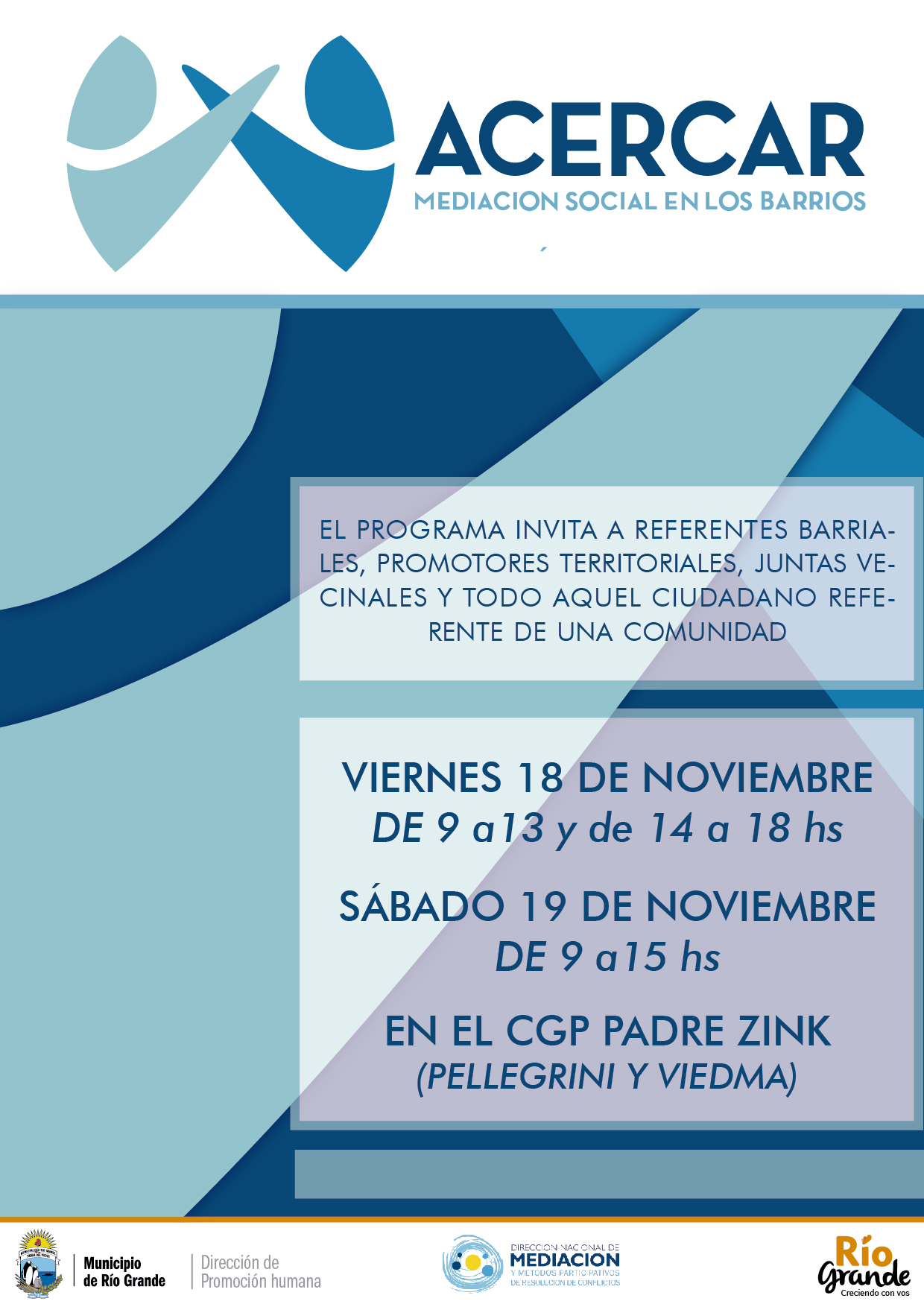 Rio Grande 15/11/16 .-En el marco de un acuerdo entre el Municipio de Río grande y el Ministerio de Justicia y Derechos Humanos de la Nación, el próximo 18 y 19 de noviembre se realizará en el CGP “Padre Zink” una capacitación denominada “Programa ACERCAR”, mediante la cual se formará mediadores para solucionar conflictos vecinales sin intervención de la justicia.
