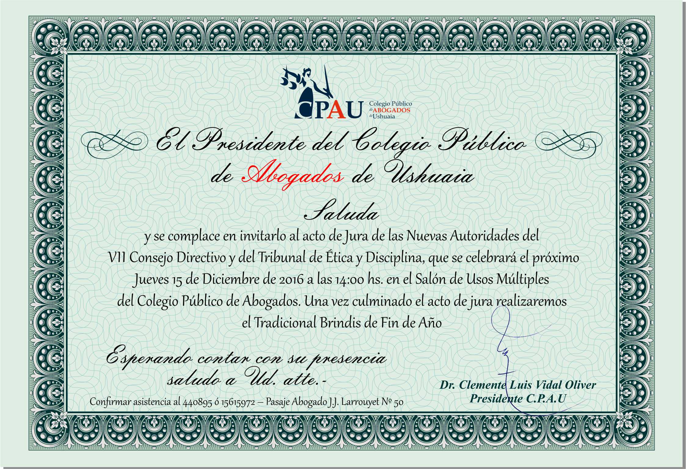 Ushuaia 14/12/16 .-El Colegio Público de Abogados de Ushuaia comunica la realización de la “Jura del VII CONSEJO DIRECTIVO Y TRIBUNAL DE ÉTICA Y DISCIPLINA del COLEGIO PÚBLICO DE ABOGADOS DE USHUAIA” a desarrollarse en la ciudad de Ushuaia el día 15 de diciembre del corriente a las 14 horas, en la SEDE ADMINISTRATIVA del CPAU sita en Pasaje Abogado Juan José Larrouyet N° 50. Ushuaia – TDF.