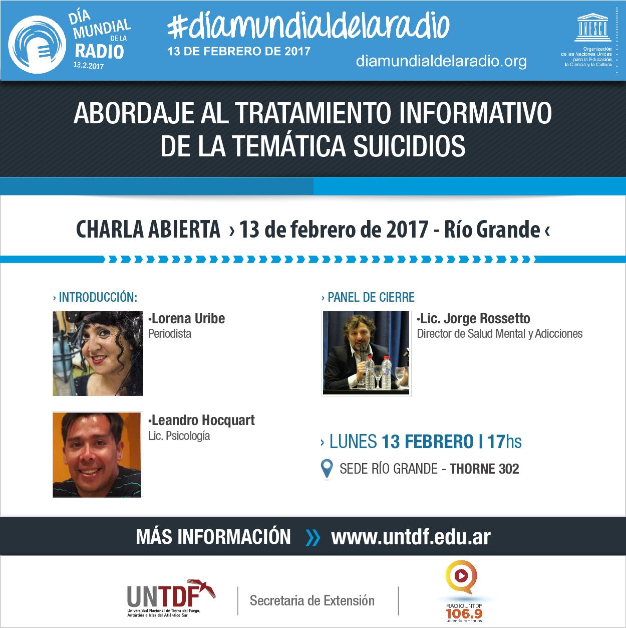 Río Grande, 10 de febrero de 2017.- La Universidad Nacional de Tierra del Fuego (UNTDF) a través de la FM106.9 Radio UNTDF de Rio Grande, participará del evento internacional organizado por la UNESCO para conmemorar el Día Mundial de la Radio. Bajo el lema “La Radio sos vos”, el tema a reflexionar y debatir se centrará en el tratamiento informativo que realizan los medios radiales sobre la temática del suicidio en Tierra del Fuego y el rol que cumplen diversos actores sociales.