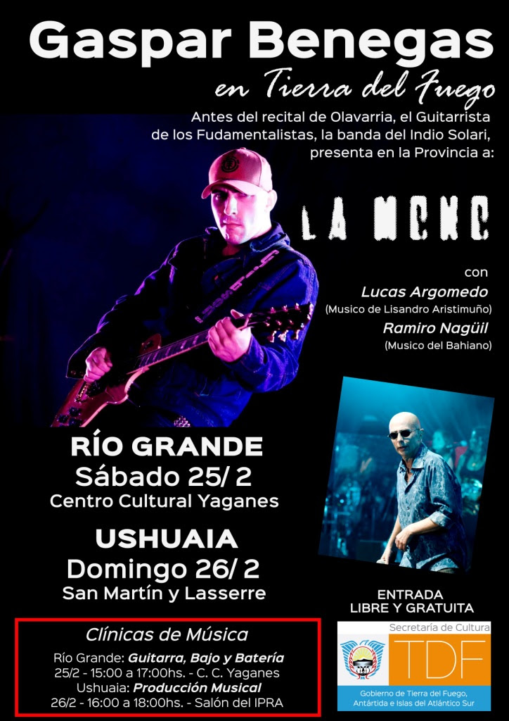 En Río Grande la clínica se dictará el mismo sábado 25, también en el Centro Cultural Yaganes, entre las 15:00 y las 17:00hs. y tratará sobre guitarra, bajo y batería. Mientras que en la ciudad de Ushuaia, la Clínica será sobre Producción Musical y se dictará en el Salón del IPRA, ubicado en San Martín 360, el domingo 26 en el horario de 16:00 a 18:00hs. Las clínicas son libres y gratuitas y no se requiere inscripción previa.