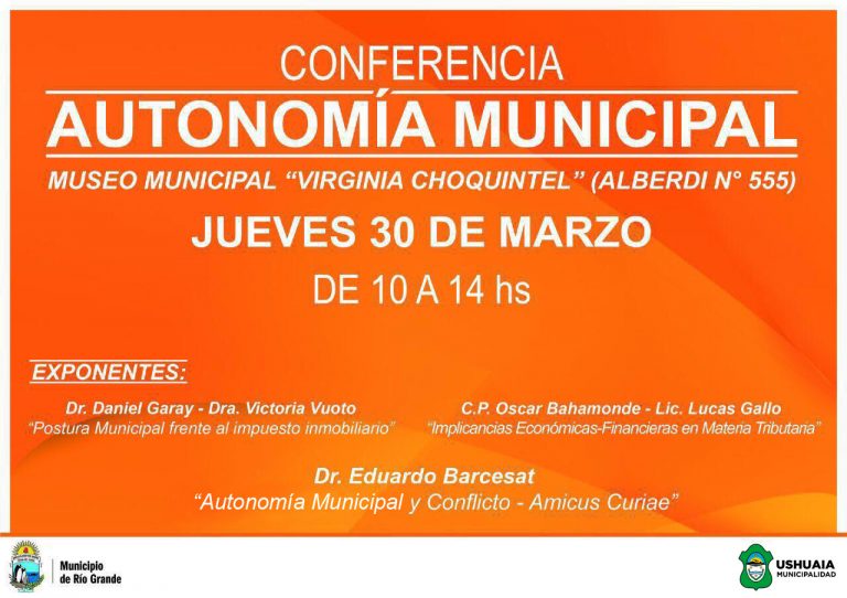 Mart 28/03/17 .- En el marco de la judicialización del cobro del Impuesto Inmobiliario que impulsó la agencia recaudadora provincial, funcionarios de las municipalidades de Ushuaia y Río Grande expondrán este jueves 30 de marzo sobre la postura de ambos Ejecutivos. El encuentro permitirá explicar y detallar las respuestas elevadas por cada Municipio al Superior Tribunal de Justicia ante la presentación de la AREF, la aplicación de los recursos en las políticas públicas municipales y la exposición del constitucionalista Eduardo Barcesat sobre la Autonomía municipal.