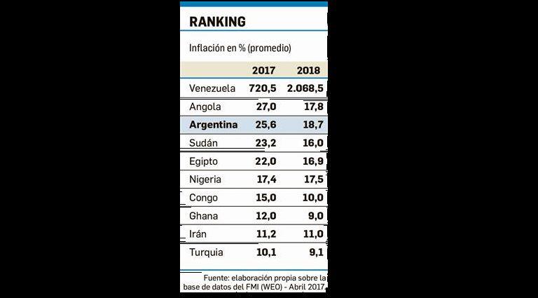 La inflación en Argentina es la más alta de la región después de Venezuela (el Fondo estima la inflación venezolana del año en 720% y la proyecta en 2,068% para 2018) y una de las más altas del mundo. Tanto es así que el Fondo excluye expresamente a Argentina y Venezuela cuando calcula que los mercados emergentes y en desarrollo tendrían en 2017 una inflación de 4,7%, por encima del 4,4% del año pasado, en gran medida como consecuencia del encarecimiento de las materias primas.