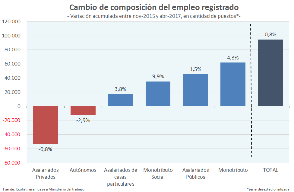 El mercado laboral argentino se está reconfigurando. Desde noviembre de 2015 a abril de 2017 el empleo registrado creció, en términos desestacionalizados, 0,8%. Es decir que en lo que va de gestión Mauricio Macri, 95 mil trabajadores se sumaron al mercado formal. Pero además, detrás de este magro crecimiento se esconde un cambio en la composición que no es menor, en tanto se observa una evolución diferenciada del empleo de acuerdo al tipo de contratación.