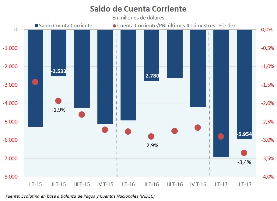Conforme a los datos de Balanza de Pagos (BP) recientemente publicados por el INDEC, la Cuenta Corriente (CC) arrojó un déficit de casi US$ 6.000 millones en el segundo trimestre de 2017, más que duplicando el rojo observado durante el segundo trimestre del año pasado (US$ -2.780 millones).