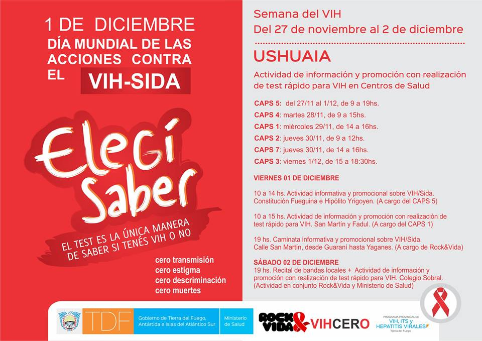Por su parte, la cartera provincial diagramó, desde el lunes 27, una semana de acciones concretas para poner en valor las distintas alternativas para conocer más sobre esta enfermedad crónica. En tanto, el viernes 1 de diciembre ofrecerá la realización de test rápido para VIH en el Centro de Salud Nº 3 de Ushuaia, de 15 a 18,30.