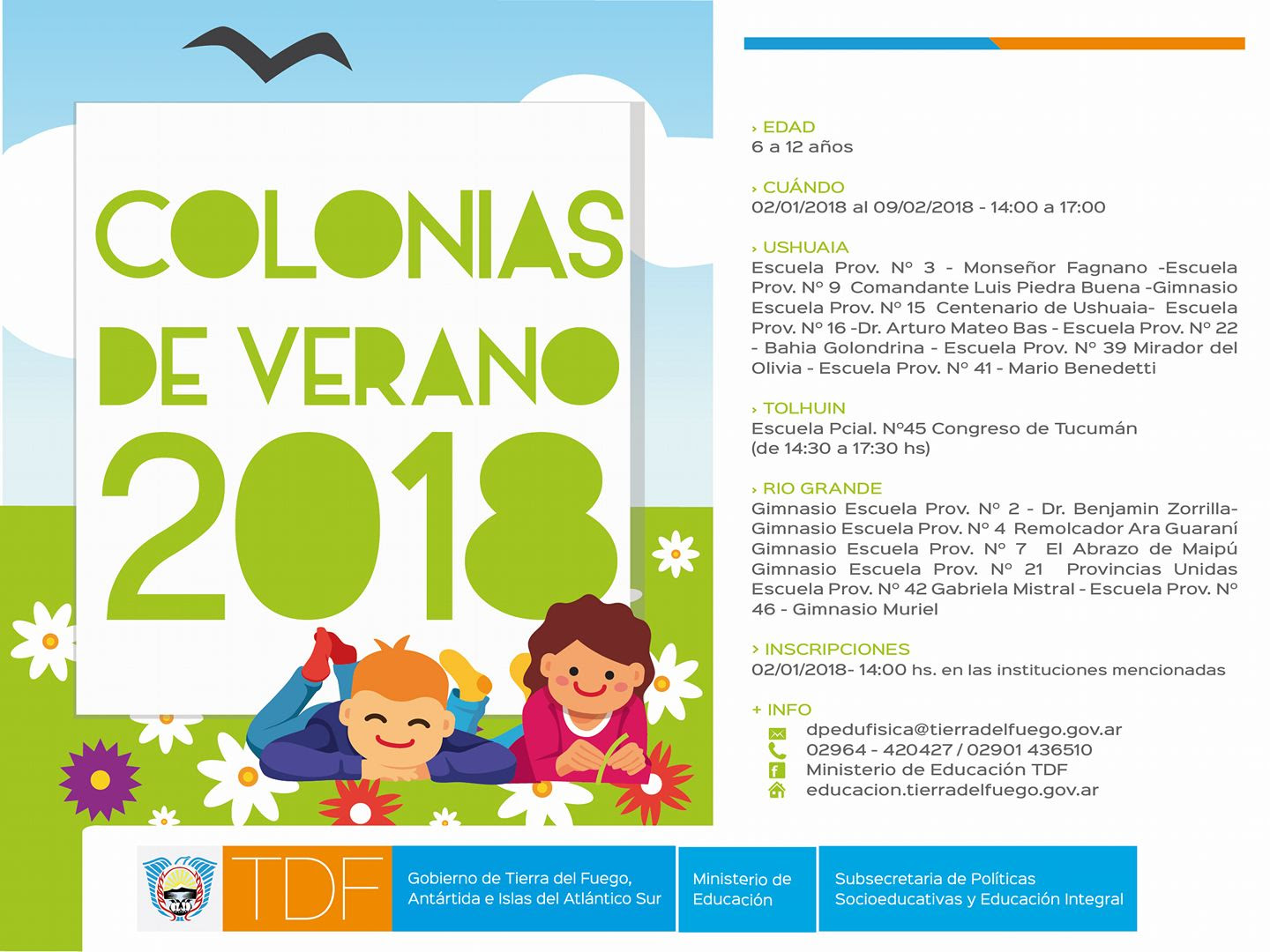 El periodo de las Colonias comprenderá del 2 de enero al 9 de febrero, iniciando las inscripciones el mismo 2 de enero. Los requisitos para inscribirse son copia de DNI del menor, el cual deben acercarlo a las escuelas donde se dictarán las colonias y allí se les entregará a los adultos responsables una ficha médica y la autorización para las actividades que se realizarán.