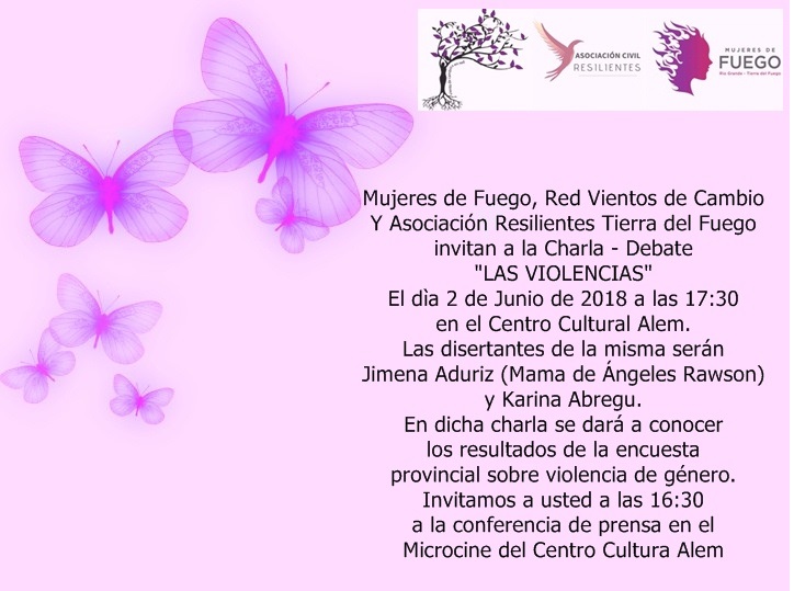 Mujeres de Fuego, Red Vientos de Cambio y Asociación Resilientes Tierra del Fuego invitan a la charla-debate «LAS VIOLENCIAS» que se realizará el día 2 de junio a las 17:30 en el Centro Cultural Alem. En la misma disertarán Jimena Aduriz (mama de Ángeles Rawson) y Karina Abregu. También se darán a conocer los resultados de la Encuesta Provincial sobre Violencia de Género.