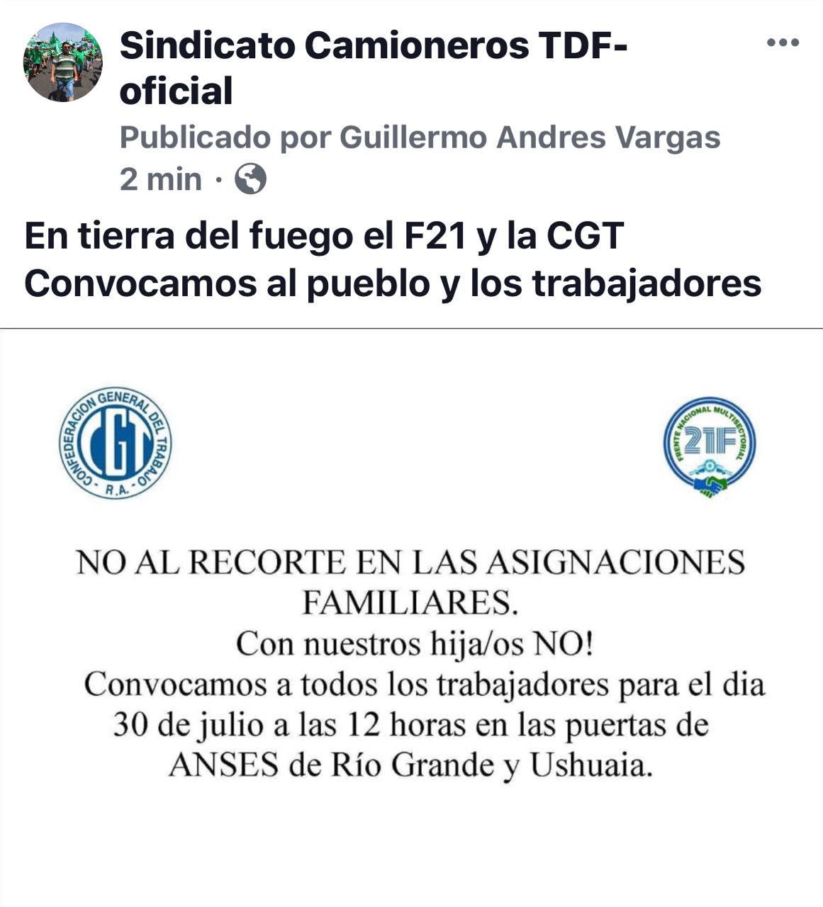 La convocatoria partió de la Multisectorial Rio Grande, luego de conocidos los recortes anunciados por el gobierno Nacional y publicados en el Boletín oficial en el día de ayer que recortan asignaciones familiares y bonifican por zona, dos beneficios obtenidos por ley y que están vigentes en la Ley de Promoción Industrial y Económica de Tierra del Fuego.
