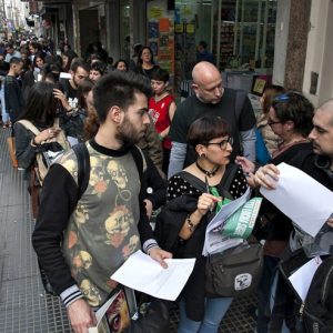 Hay un constante movimiento entre los que se suman a la fila sobre Corrientes, los que reparten el formulario, los que cruzan a sacar fotocopia del DNI y la gente que anda por ahí. Pese a las dificultades para desplazarse, todo fluye amablemente hasta que un par de señoras empujan a todos y protestan porque “éstas ya no saben qué hacer y ahora se la agarran con la Iglesia”. La sorpresa provoca un momento de silencio general y se oye “que la semana pasada hubo dos muertas por aborto clandestino, por eso están enojados” y un grupo de “chicas” de alrededor de setenta años se ponen en fila india contra la pared y van pidiendo permiso para pasar.