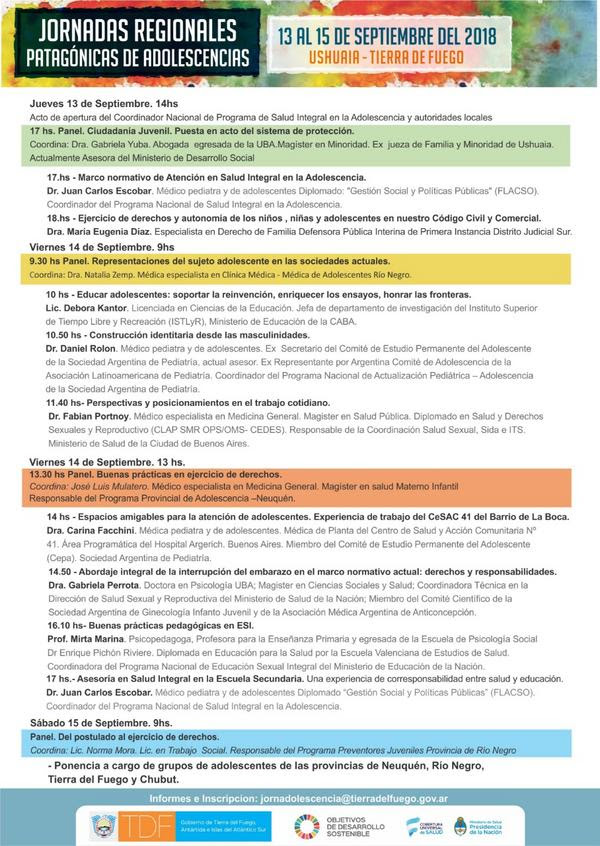 Lun 10/09/18.- Organizado por el Ministerio de Salud, se llevarán adelante entre el 13 y el 15 de septiembre las “Jornadas Regionales Patagónicas de Adolescencias” -en el en el Gimnasio del Colegio Polivalente de Arte “Roberto Fontanarrosa”, ubicado en Alem 15 de Ushuaia- con la participación de grupos de adolescentes de Neuquén, Río Negro, Chubut y Tierra del Fuego.