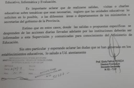 Ante la consulta, su superior jerárquica, la directora de Educación provincial Gloria Patricia Pereda, respondió que “de realizarse salidas, visitas o charlas educativos sobre las temáticas que sean necesarias, sugiero que las unidades educativas lo soliciten en lo posible, a las diferentes áreas o departamentos de los ministerios o secretarías del gobierno de la Provincia”.